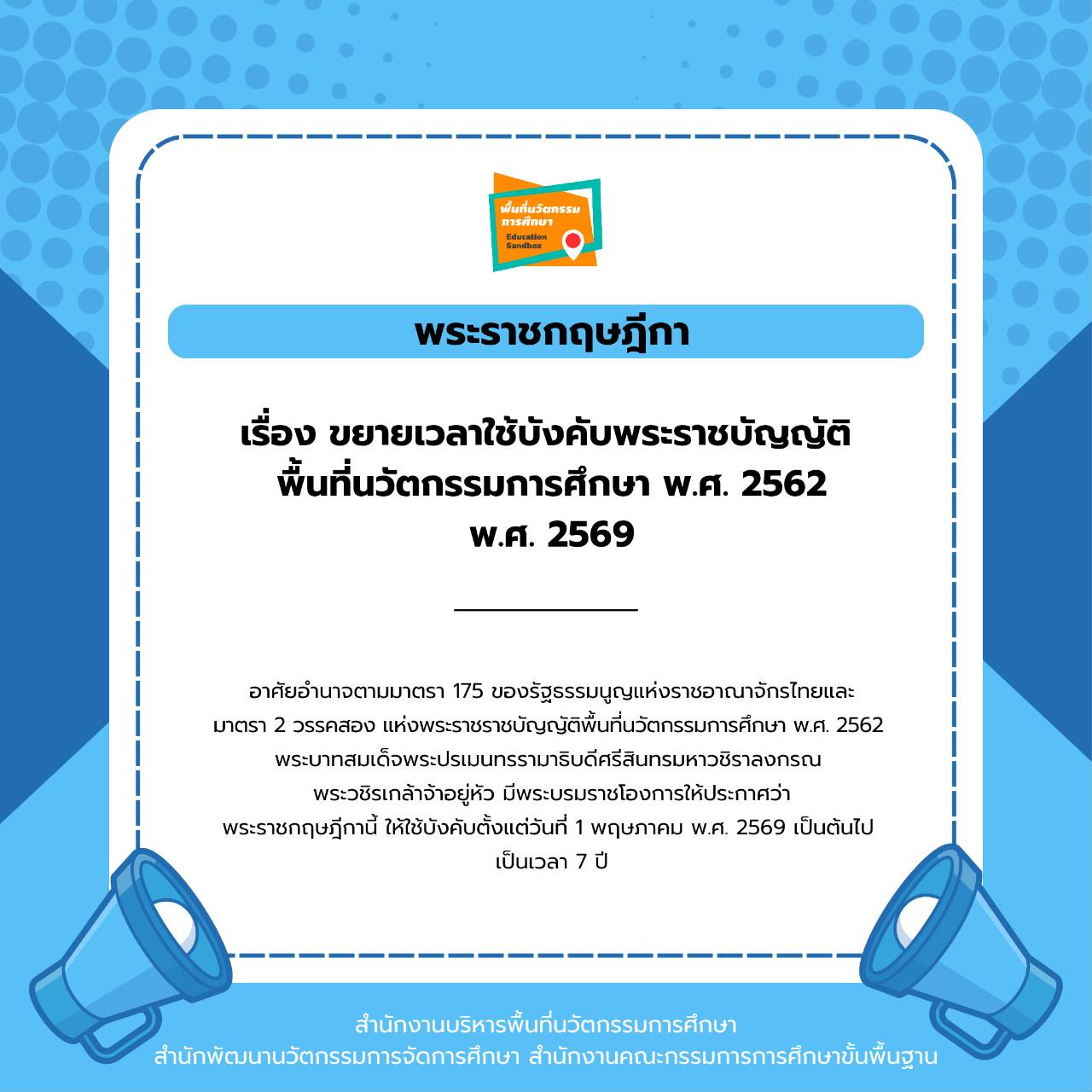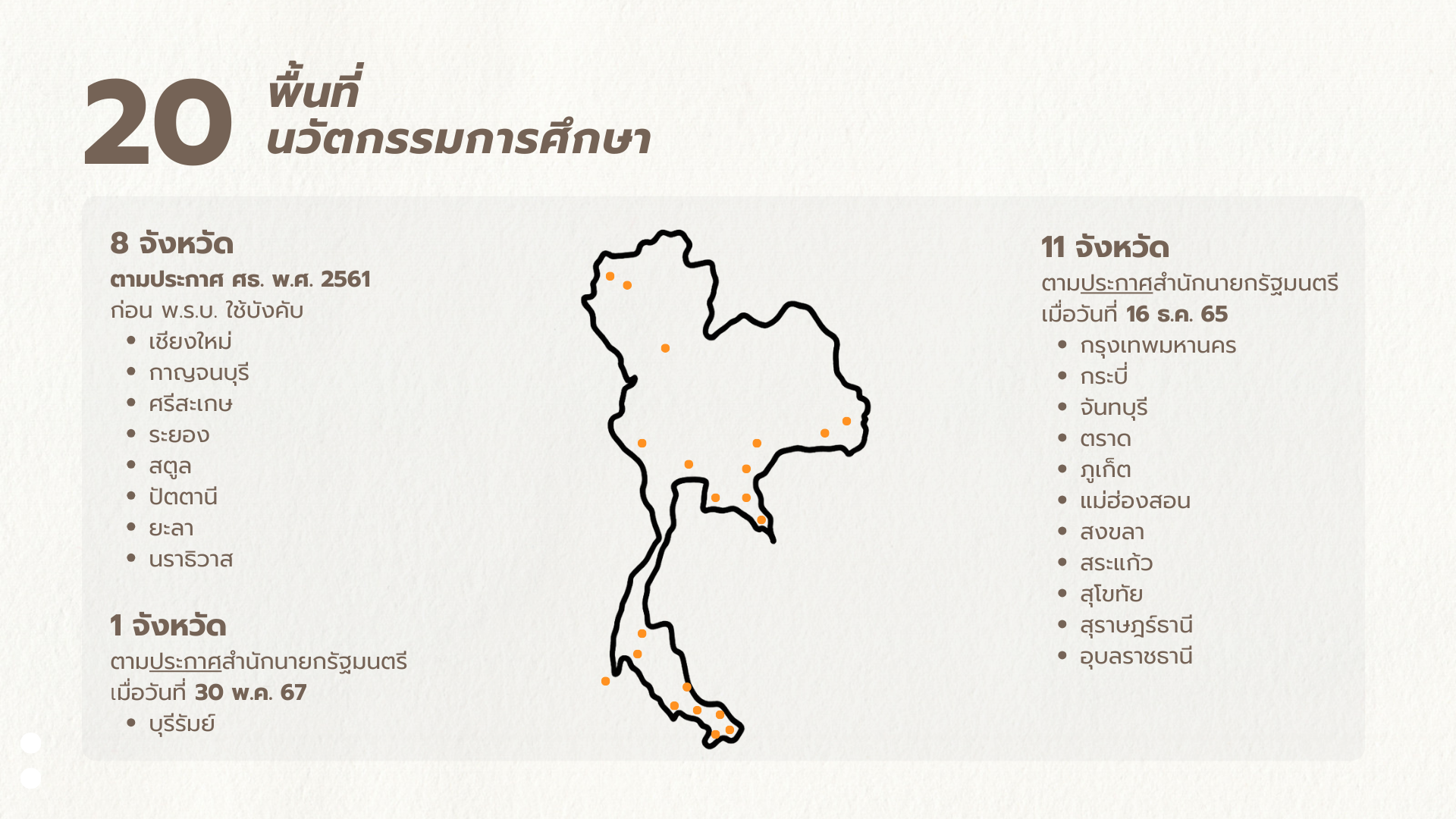 พระราชบัญญัติพื้นที่นวัตกรรมการศึกษา พ.ศ. 2562 ซึ่งประกาศในราชกิจจานุเบกษา เมื่อวันที่ 30 เมษายน 2562 มีผลบังคับใช้เมื่อวันที่ 1 พฤษภาคม 2562 มีเหตุผลในการประกาศใช้พระราชบัญญัติฉบับนี้ คือ ต้องพัฒนาการจัดการศึกษาขั้นพื้นฐานอันเป็นรากฐานสำคัญของการพัฒนาคนไทยให้มีคุณภาพ มีความใฝ่รู้ มีความคิดสร้างสรรค์มีความสามารถในการสื่อสาร สามารถอยู่และทำงานร่วมกับผู้อื่นซึ่งมีความแตกต่างหลากหลายได้ มีความรู้เท่าทันโลก และมีทักษะในการประกอบอาชีพตามความถนัดของผู้เรียนแต่ละคน และให้รัฐ องค์กรปกครองส่วนท้องถิ่น ภาคเอกชน และ ภาคประชาสังคม ร่วมกันพัฒนาคุณภาพและประสิทธิภาพและลดความเหลื่อมล้ำในการจัดการศึกษาขั้นพื้นฐาน ได้อย่างแท้จริงสมควรกำหนดให้มีพื้นที่นวัตกรรมการศึกษาซึ่งเป็นพื้นที่ปฏิรูปการบริหารและการจัดการการศึกษาขึ้นเพื่อสนับสนุนการสร้างนวัตกรรมการศึกษาอันเป็นการนำร่องในการกระจายอำนาจและให้อิสระแก่หน่วยงานทางการศึกษาและสถานศึกษาขั้นพื้นฐาน ให้เกิดการพัฒนาคุณภาพและประสิทธิภาพและลดความเหลื่อมล้ำ รวมทั้งมีการขยายผลนวัตกรรมการจัดการเรียนการสอนและวิธีการปฏิบัติที่ดีไปใช้ในสถานศึกษาอื่นต่อมาคณะรัฐมนตรีได้ประกาศกำหนดพื้นที่นวัตกรรมการศึกษา 11 จังหวัด เมื่อวันที่ 16 ธันวาคม 2565 ประกอบด้วย กรุงเทพมหานคร จังหวัดกระบี่ จังหวัดจันทบุรี จังหวัดตราด จังหวัดภูเก็ต จังหวัดแม่ฮ่องสอนจังหวัดสงขลา จังหวัดสระแก้ว จังหวัดสุโขทัย จังหวัดสุราษฎร์ธานี และจังหวัดอุบลราชธานี และต่อมาคณะรัฐมนตรี ได้ประกาศกำหนดจังหวัดบุรีรัมย์ เป็นพื้นที่นวัตกรรมการศึกษา เมื่อวันที่ 30 พฤษภาคม 2567 ส่งผลให้ปัจจุบัน มีพื้นที่นวัตกรรมการศึกษา รวมทั้งสิ้น 20 พื้นที่