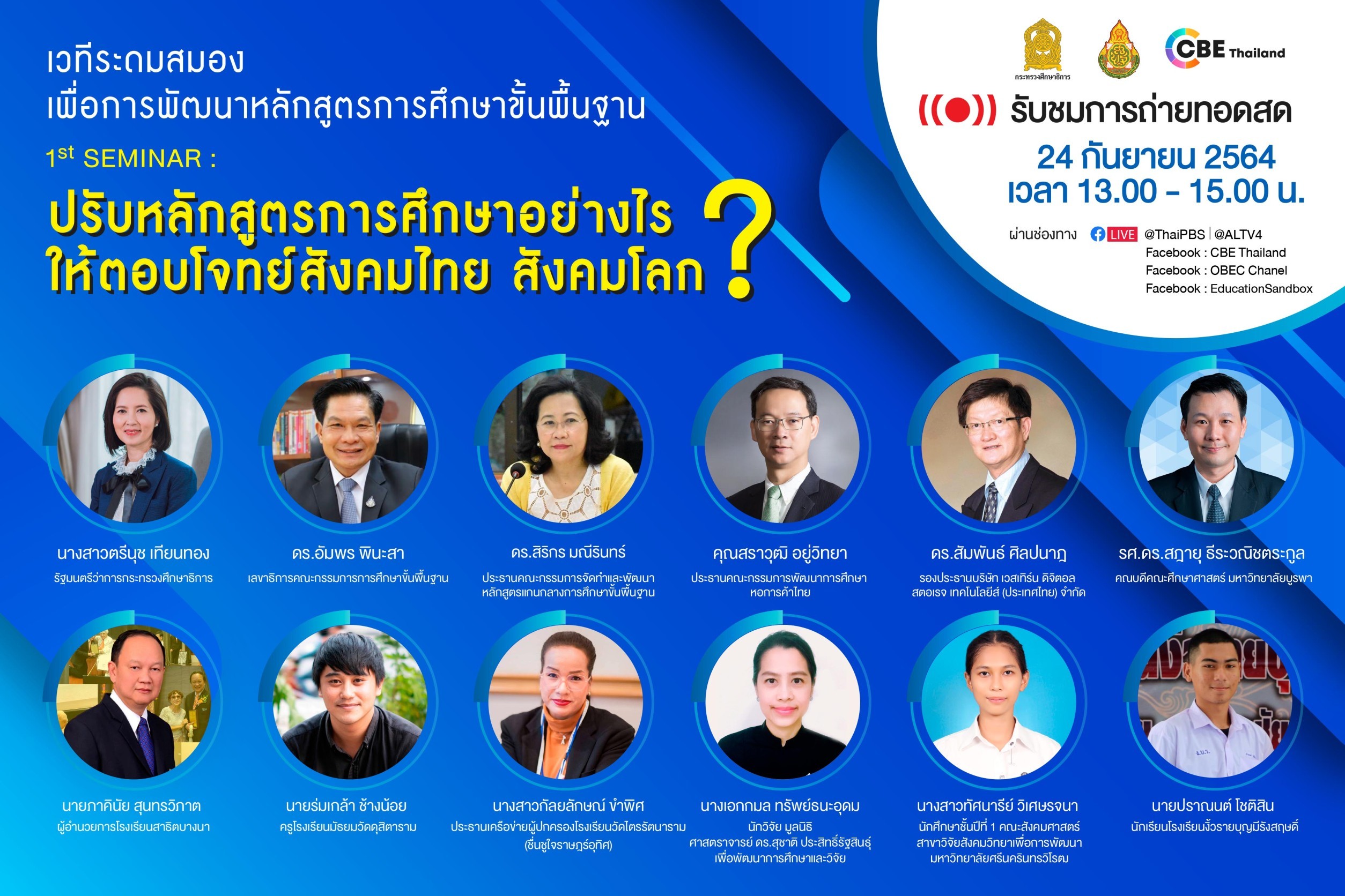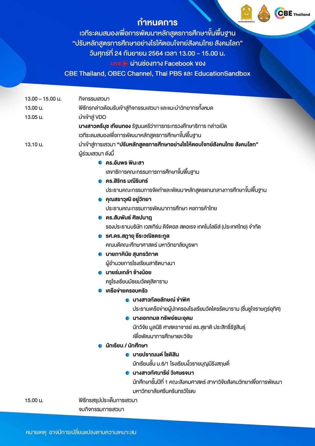 คณะอนุกรรมการสื่อสารและการมีส่วนร่วม ในคณะกรรมการพัฒนาและจัดทำ (ร่าง) หลักสูตรแกนกลางการศึกษาขั้นพื้นฐาน พุทธศักราช …. (หลักสูตรฐานสมรรถนะ) กระทรวงศึกษาธิการ จัดเวทีระดมสมองเพื่อการพัฒนาหลักสูตรการศึกษาขั้นพื้นฐานครั้งที่ 1 ผ่าน Facebook live : CBE Thailand และเครือข่าย วันศุกร์ที่ 24 ก.ย. 2564 เวลา 13.00 – 15.00 น.