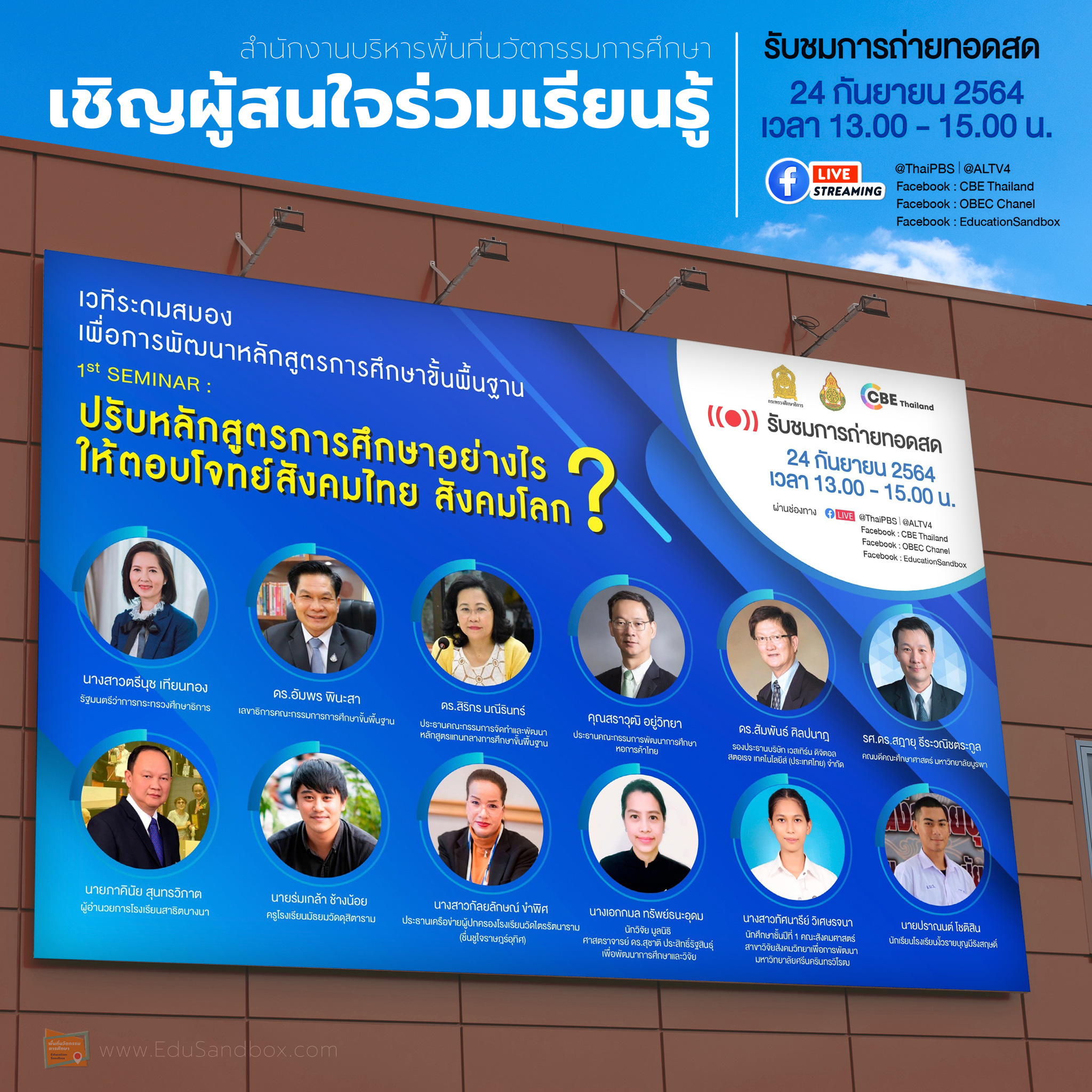 คณะอนุกรรมการสื่อสารและการมีส่วนร่วม ในคณะกรรมการพัฒนาและจัดทำ (ร่าง) หลักสูตรแกนกลางการศึกษาขั้นพื้นฐาน พุทธศักราช …. (หลักสูตรฐานสมรรถนะ) กระทรวงศึกษาธิการ จัดเวทีระดมสมองเพื่อการพัฒนาหลักสูตรการศึกษาขั้นพื้นฐานครั้งที่ 1 ผ่าน Facebook live : CBE Thailand และเครือข่าย วันศุกร์ที่ 24 ก.ย. 2564 เวลา 13.00 – 15.00 น.