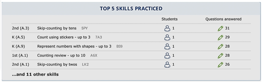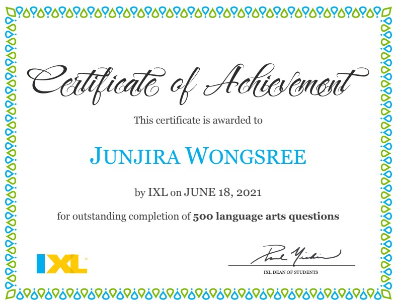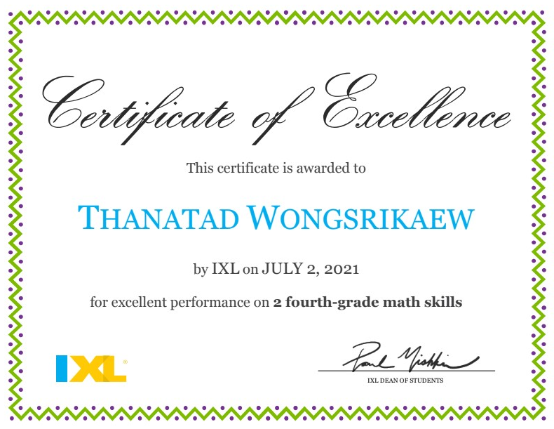 ผลการเรียนรู้ของนักเรียนชั้นประถมศึกษาปีที่ ๔-๖ จำนวน ๒๗ คน แสดงใน dashboard ของแอพพลิเคชั่น IXL Learning ตั้งแต่เดือนมิถุนายน ถึงเดือนปลายเดือนกรกฎาคม ๒๕๖๔ แสดงให้เห็นว่านักเรียนตอบคำถามได้ทั้งสิ้น ๒๗,๘๓๒ คำถาม ใช้เวลาเรียนทั้งสิ้น ๗๖ ชั่วโมง เรียนที่โรงเรียน ๔๓ ชั่วโมง และเรียนที่บ้านใช้ ๓๓ ชั่วโมง ทำให้นักเรียนมีทักษะในระดับเชี่ยวชาญ (skills mastered) ๖๔๐ ทักษะ และทักษะในระดับชำนาญ (skills proficient) ๖๕๘ ทักษะ การเรียนรู้ของนักเรียนเกิดจากการสั่งสมประสบการณ์ ความอยากรู้ และการสนับสนุนของผู้ปกครอง ในที่นี้ขอยกตัวอย่าง ดังนี้