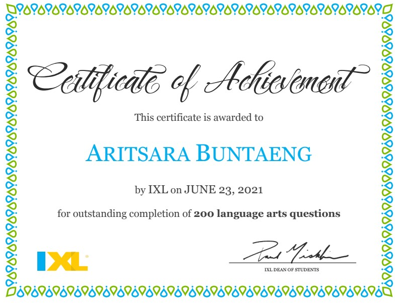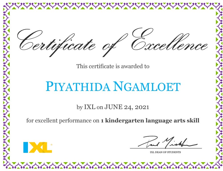 วิธีเรียนแบบนี้ต่างกับครูตรงที่ไม่มีใครอธิบายให้ เราต้องทำเอง ประทับใจกับการเรียนนี้เพราะได้ยินเสียงเป็นภาษาอังกฤษ เป็นเสียงที่อ่านข้อสอบให้ฟัง เลยชอบและอยากเรียนอยากฟัง อยากให้น้องๆ เริ่มเรียนตั้งแต่ชั้น ป.๑ เลย เลือกแบบฝึกที่ง่ายๆ ก่อน คำศัพท์ภาษาอังกฤษที่อ่าน เขียน และแปลความหมายได้ เช่น one, two, three, four, fifth รู้สึกประทับใจที่เรียนแล้วได้ใบเกียรติบัตรจากต่างประเทศด้วย ดีและสะดวกทั้งที่ไม่เคยรู้จักว่าใครเป็นคนให้