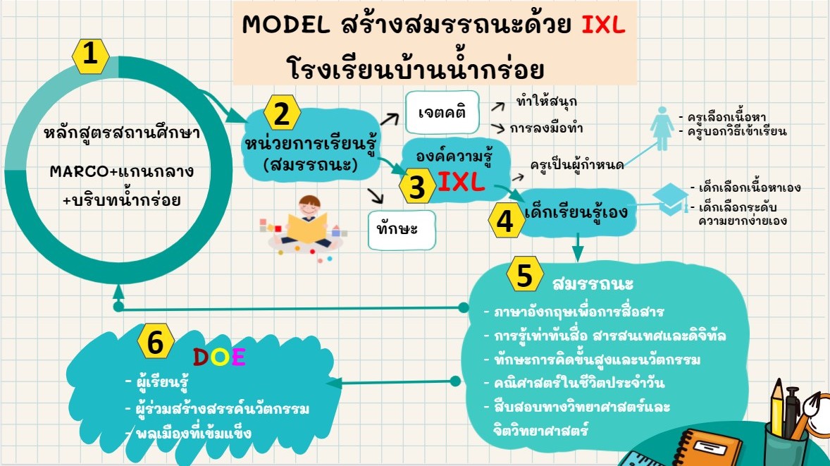 โรงเรียนบ้านน้ำกร่อยเชื่อว่า การให้นักเรียนฝึกบ่อย ทำบ่อย เผชิญเหตุบ่อย ทำให้เกิดสมรรถนะ อย่างน้อยการที่นักเรียนเรียนรู้ผ่าน IXL ด้วยตนเอง โดยมีครูพิพัฒน์ พานิชย์พะเนาว์ หรือ ครูมอส ครูประจำชั้นประถมศึกษาปีที่ ๔ เป็นผู้ฝึกฝนให้ในระยะแรก และต่อมานักเรียนมาโรงเรียนไม่ได้ จึงฝึกฝนต่อด้วยตนเอง ส่งผลให้นักเรียนเกิดสมรรถนะอย่างชัดเจนอย่างน้อย ๔ สมรรถนะ