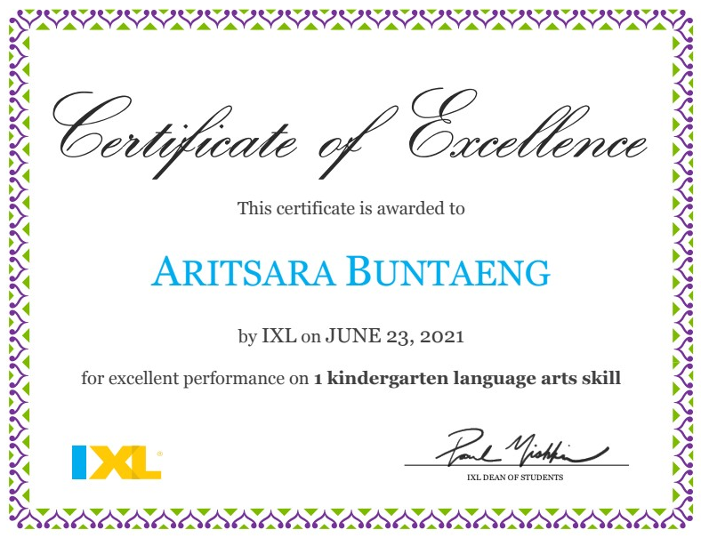 วิธีเรียนแบบนี้ต่างกับครูตรงที่ไม่มีใครอธิบายให้ เราต้องทำเอง ประทับใจกับการเรียนนี้เพราะได้ยินเสียงเป็นภาษาอังกฤษ เป็นเสียงที่อ่านข้อสอบให้ฟัง เลยชอบและอยากเรียนอยากฟัง อยากให้น้องๆ เริ่มเรียนตั้งแต่ชั้น ป.๑ เลย เลือกแบบฝึกที่ง่ายๆ ก่อน คำศัพท์ภาษาอังกฤษที่อ่าน เขียน และแปลความหมายได้ เช่น one, two, three, four, fifth รู้สึกประทับใจที่เรียนแล้วได้ใบเกียรติบัตรจากต่างประเทศด้วย ดีและสะดวกทั้งที่ไม่เคยรู้จักว่าใครเป็นคนให้
