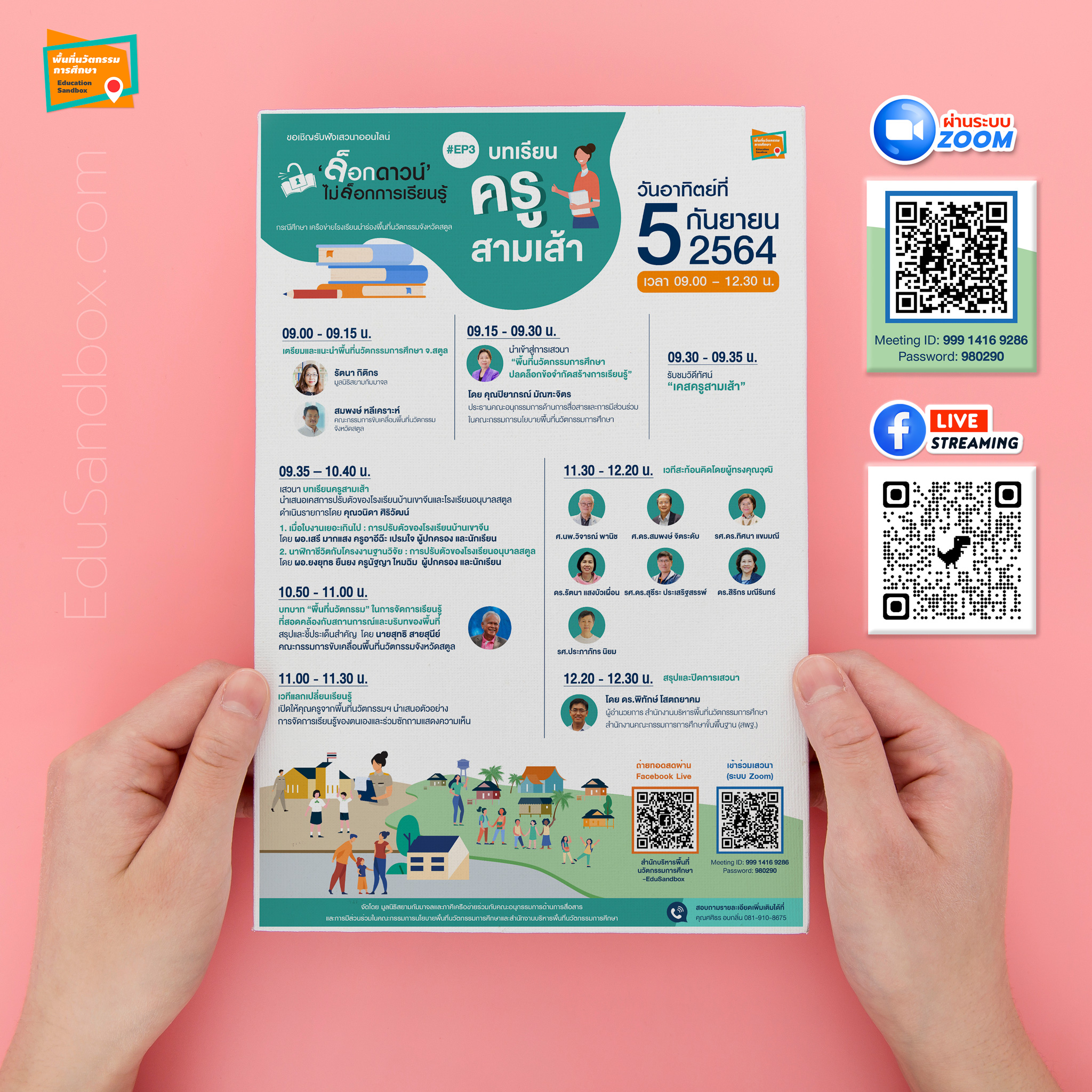 ขอเชิญผู้สนใจเข้าร่วมการเสวนาออนไลน์ ‘ล็อกดาวน์’ ไม่ล็อกการเรียนรู้ ครั้งที่ 3 “บทเรียนครูสามเส้า” กรณีศึกษา เครือข่ายโรงเรียนนำร่องพื้นที่นวัตกรรมการศึกษาจังหวัดสตูล นำเสนอตัวอย่างการปรับตัวภายใต้บริบทของพื้นที่และสถานการณ์ที่เปลี่ยนไปของโรงเรียนบ้านเขาจีนและโรงเรียนอนุบาลสตูล ในวันอาทิตย์ที่ 5 กันยายน 2564 เวลา 09.00 -12.30 น.