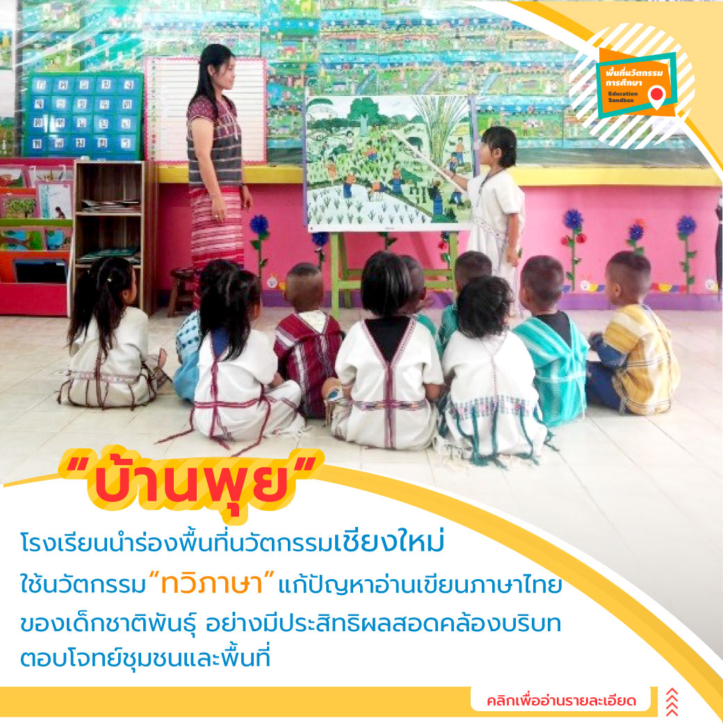 “ทวิภาษา” นวัตกรรมการศึกษาเพื่อเด็กบ้านพุย เป็นการจัดการเรียนรู้ของเด็กกลุ่มชาติพันธุ์ หรือนักเรียนที่ใช้ภาษาอื่นเป็นภาษาที่ 1 เพื่อแก้ไขปัญหาการอ่านออกเขียนได้ภาษาไทย ซึ่งโรงเรียนบ้านพุยได้นำนวัตกรรมนี้มาใช้กับนักเรียนชั้นปฐมวัย – ชั้นประถมศึกษาปีที่ 3 โดยใช้ครูถิ่นเข้ามาช่วยในการสื่อสารภาษากะเหรี่ยง และค่อยๆให้เด็กได้เรียนรู้ภาษาไทย ส่งผลให้นักเรียนโรงเรียนบ้านพุยสามารถฟัง พูด อ่าน เขียน ภาษาไทยได้อย่างมีคุณภาพ เด็กมีความสุขกับการเรียน กล้าแสดงออก อัตราการขาดเรียนลดลง แต่อย่างไรก็ตาม นายวรภรพงศ์ ปันเดง ผู้อำนวยการโรงเรียนบ้านพุย กล่าวว่า โรงเรียนยังประสบปัญหาจำนวนครูไม่ครบชั้นเรียน และยังต้องการครูถิ่นหลายอัตรา เพื่อให้การขับเคลื่อนนวัตกรรมทวิภาษามีประสิทธิภาพมากยิ่งขึ้น