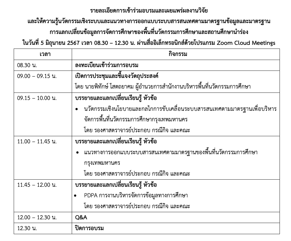 - ในวันที่ 5 มิถุนายน 2567 ผ่านสื่ออิเล็กทรอนิกส์ โปรแกรม Zoom Meetings เวลา 09.00 – 12.30 น.